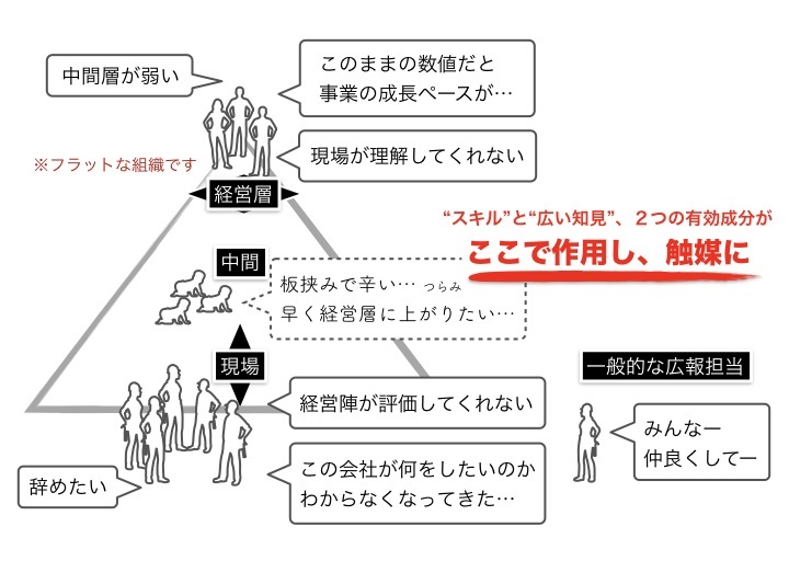 一般的には板挟みになりやすくて過酷で、好条件の環境に行きたい願望が強まるため “育ちづらく、定着しづらい” ポジションといえますが、私の場合は最も自分が活きるポジションだと思っています。